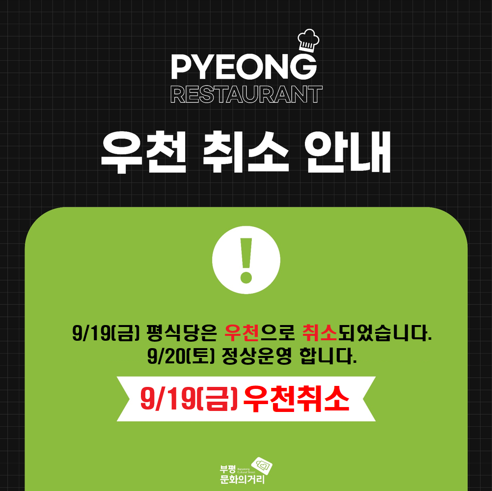 9월 19일 (금)은 우천으로 인해 평식당 운영이 취소되었습니다.