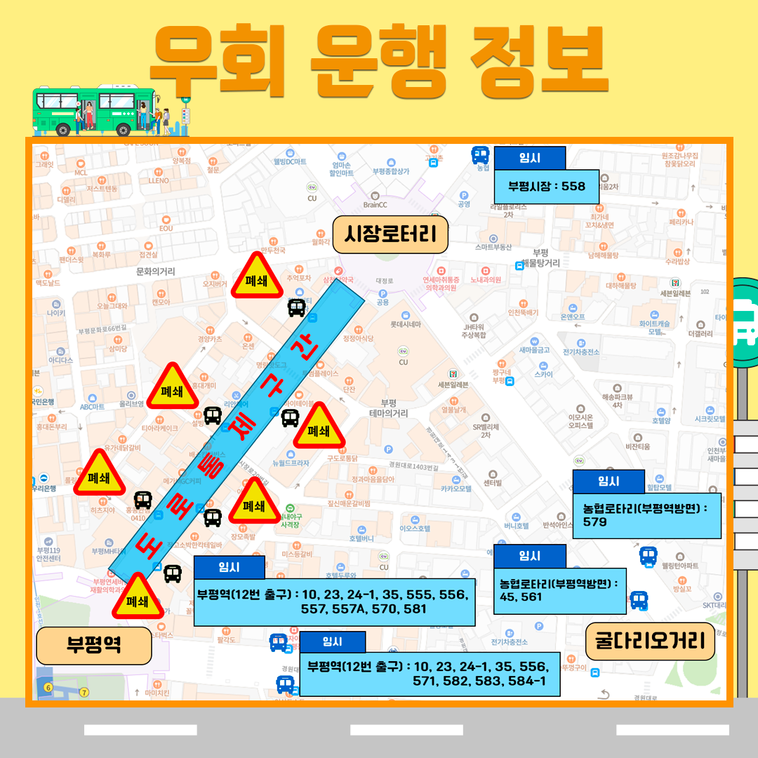 2023 힛 업 더 스트릿 기간 동안 거리가 통제됨에 따라, 시내버스가 아래와 같이 우회 운행하오니, 참고 바랍니다.